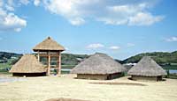 この辺りには、平屋建物[ひらやたてもの]が建ち並んでいます。これらは外国から来た渡来人や大人[たいじん](上級身分の人々)の住まい、また外国使節団の人々の宿舎などです。宿舎の他、通譯[つうやく]や交易を司る者の家、また物見櫓と番小屋があります。